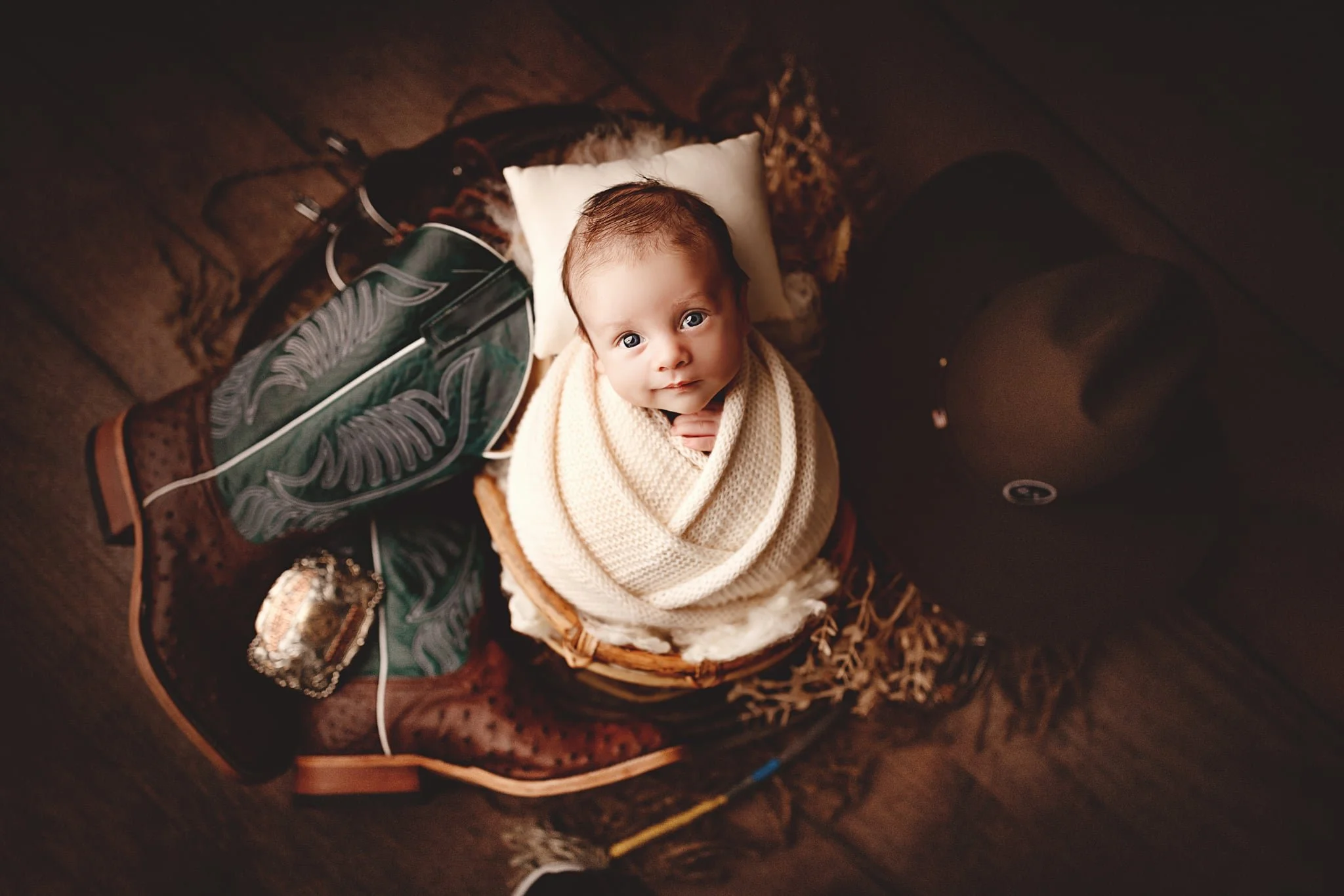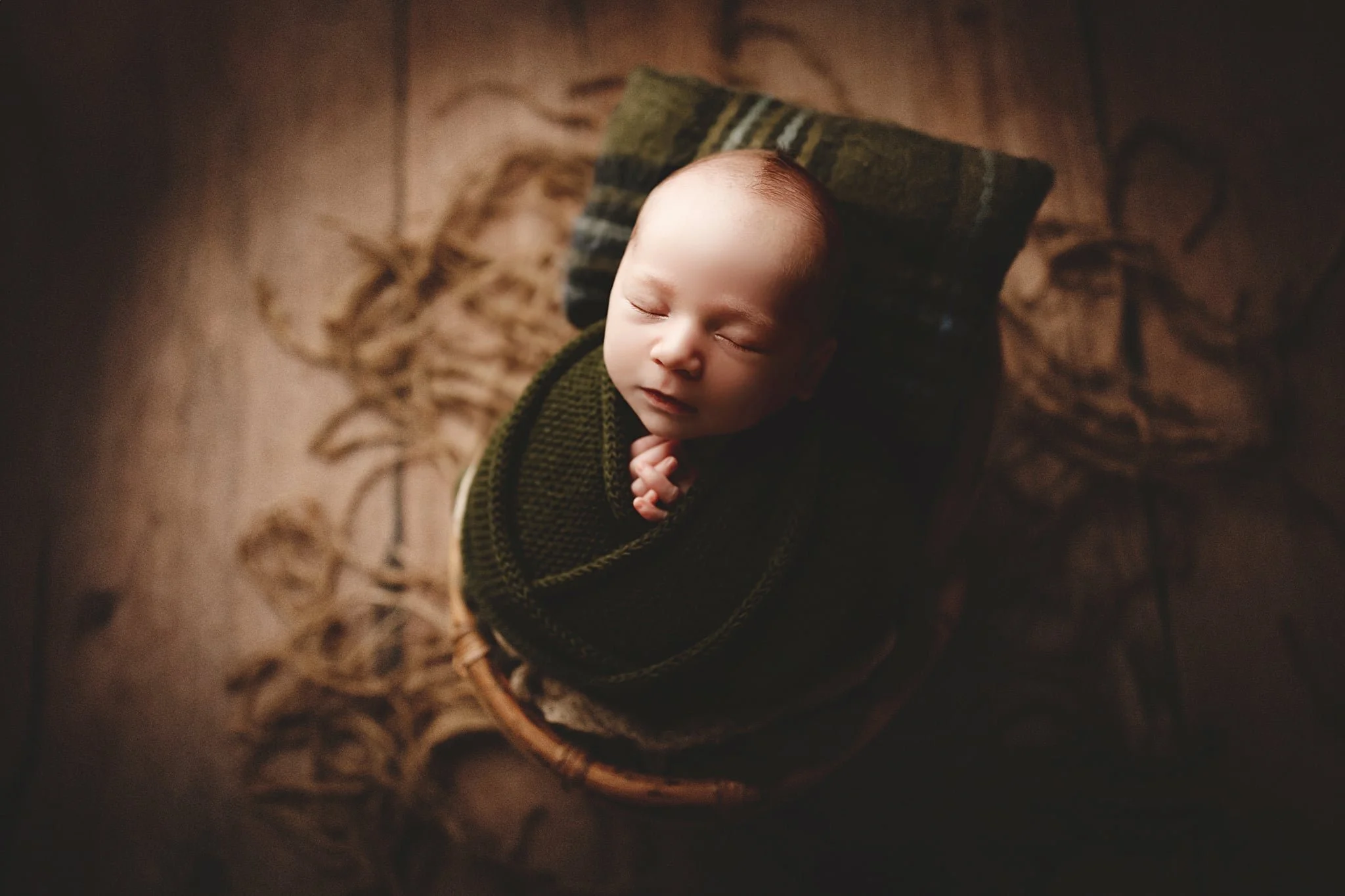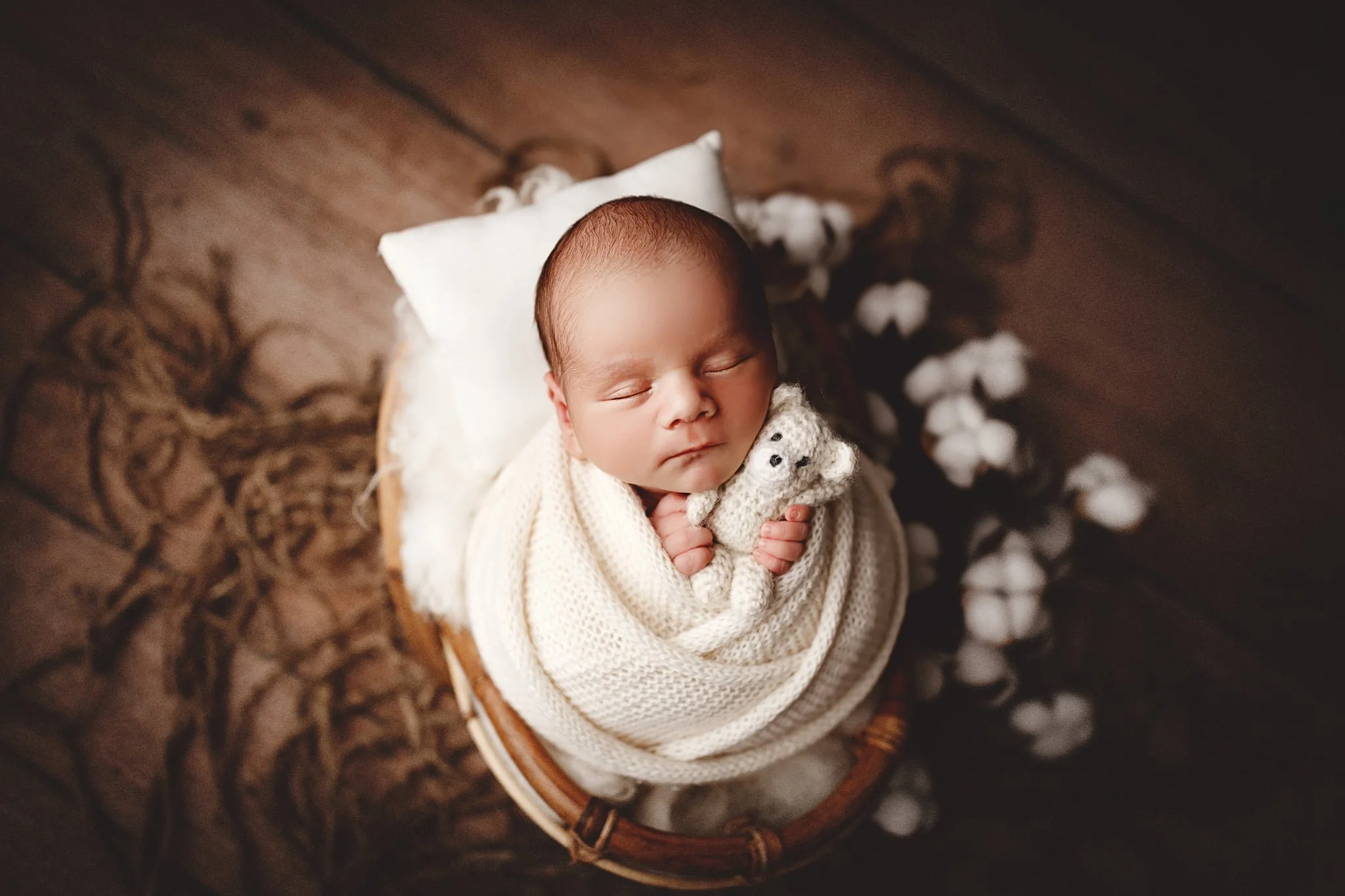 Learn how to gently and thoughtfully position baby inside the basket so the pose looks natural, supported, and visually balanced.